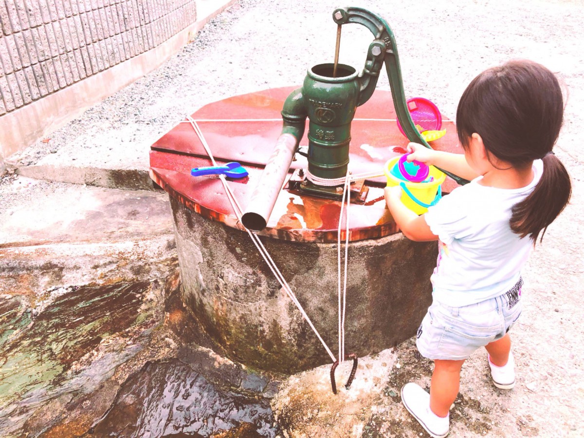 井戸の水を汲み上げながら